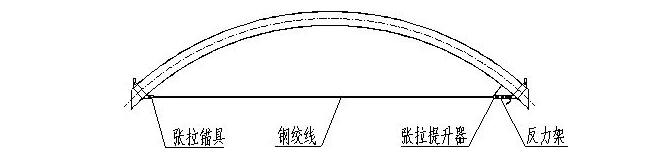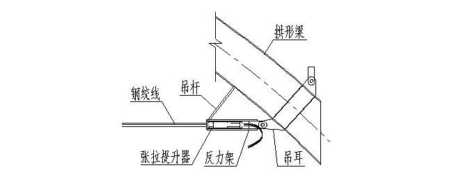 提升過程中,弧形鋼梁兩端處于自由狀態(tài),其自重產(chǎn)生的水平分力很大,為防止提升過程中鋼梁向吊點(diǎn)外伸出并伸長(zhǎng)變形,保證結(jié)構(gòu)的穩(wěn)定性,提升過程中需在吊點(diǎn)位置鋼梁底部增設(shè)水平張拉措施,防止其變形,滿足設(shè)計(jì)及提升工藝要求。鋼梁底部水平拉索張拉采用液壓提升器及鋼絞線進(jìn)行張拉,具體措施如圖4所示。